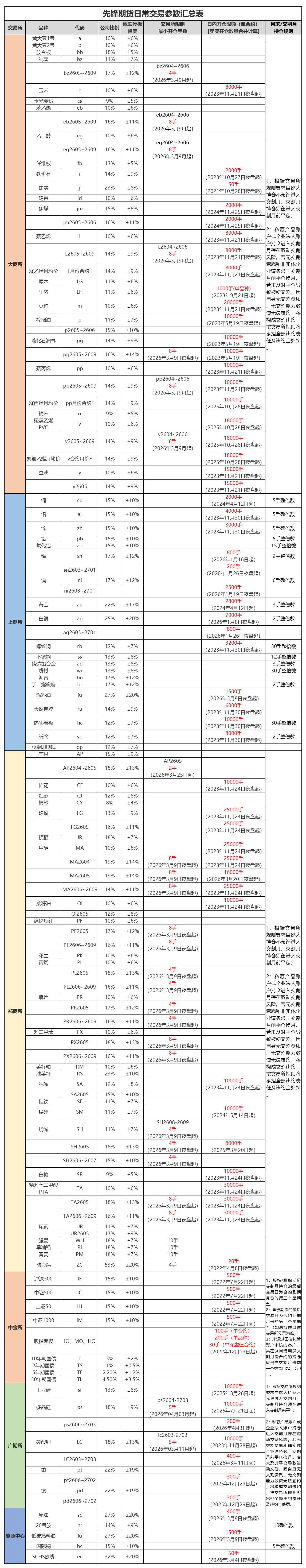 AD2604、AG2604、AL2604、AO2604、AU2604、BR2604、BU2604、CU2604、HC2604、NI2604、OP2604、PB2604、RB2604、RU2604、SN2604、SP2604、SS2604、WR2604、ZN2604合约双边收取保证金。