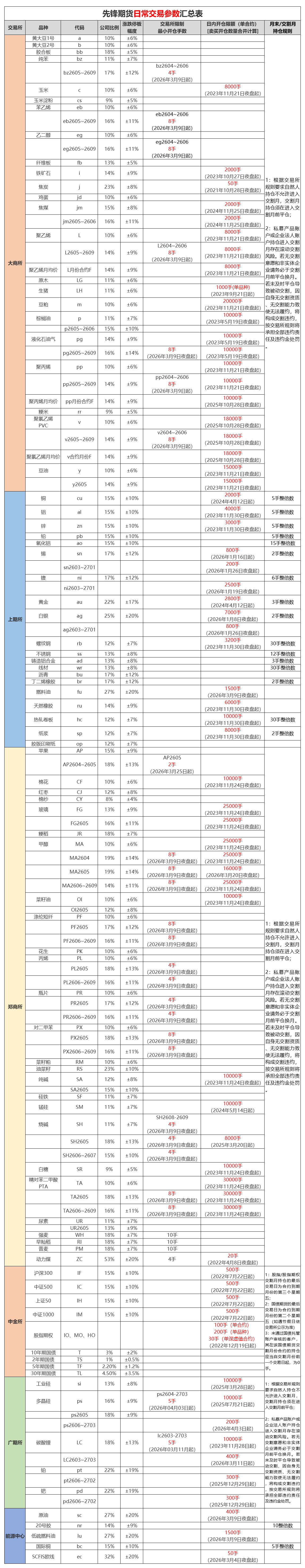 AP2605、CJ2605合约限仓为40手;CY2605、PK2605、PL2605、PR2605合约限仓为500手;SA2605合约限仓为2000手;FG合约限仓为5000手。