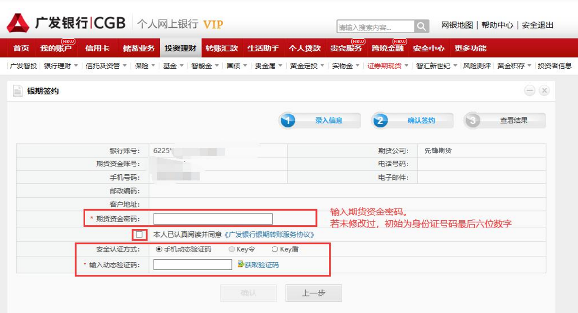 选择要签约的银行卡号,选择期货公司-先锋期货,填写期货账号