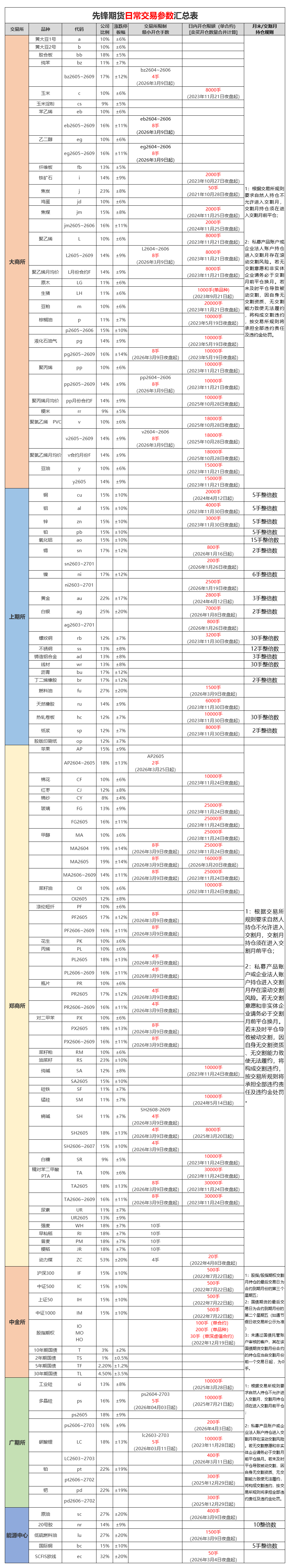 AP2605、CJ2605合约限仓为40手;CY2605、PK2605、PL2605、PR2605合约限仓为500手;SA2605合约限仓为2000手;FG合约限仓为5000手。