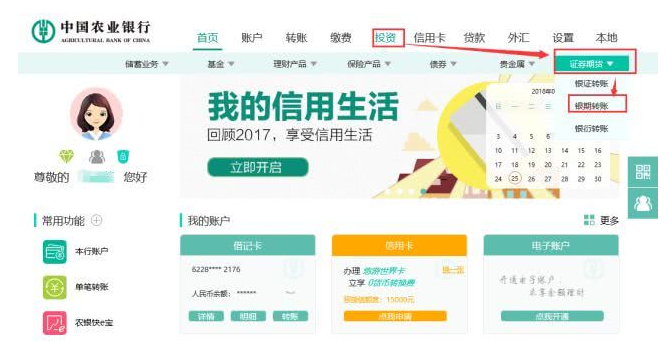 2, 登陆后点击“投资”,然后点击栏目下面的“证券期货”,再选择下拉菜单中的“银期转账”。