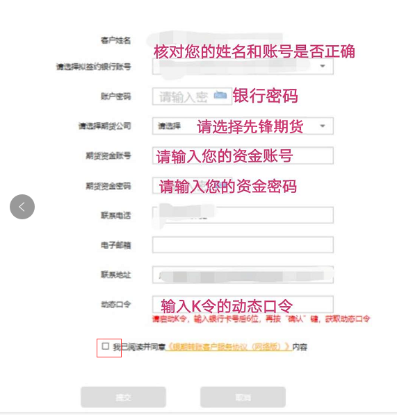 4, 按照提示输入您的银行密码,期货公司(先锋期货股份有限公司)8位的期货账户(例如8180xxxx),资金账号密码,填完之后请记得勾选“我已阅读并同意……”,然后点击提交。