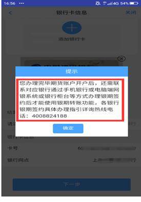 如果没有业务经理请联系:0755-88267533,我们将给您安排一个专属业务经理 (4)进入添加银行卡信息页面,上传银行卡照片后,页面中展示自动获取的银行卡基本信息。如果获取的信息有不正确的地方可以自行修改,客户可以根据需要同时上传多张银行卡。 若上传银行卡出现OCR识别失败的情况,例如银行卡磨损,模糊不清,或境外卡。系统会提示:“银行卡识别失败”,此时请在银行卡下面垫张白纸写下卡号再拍照上传,然后手动填写正确的银行卡号,则可以通过。 添加银行卡注意事项:1.系统自动识别上传的银行卡卡号,请仔细核对是否识别正确。 2.银行网点格式为:**省**市**支行(或**省**市分行营业部) 3.此处添加银行卡仅为开户时预留银行卡信息,开户成功后还需要客户银期签约才能开通银期转账功能。
