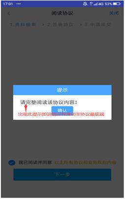 (6)进入阅读协议界面,协议需滑动至页面最底端阅读完整才可勾选。