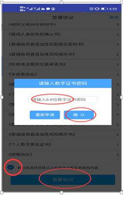 (9)进入签署协议界面,点击签署协议,输入数字证书,确认。