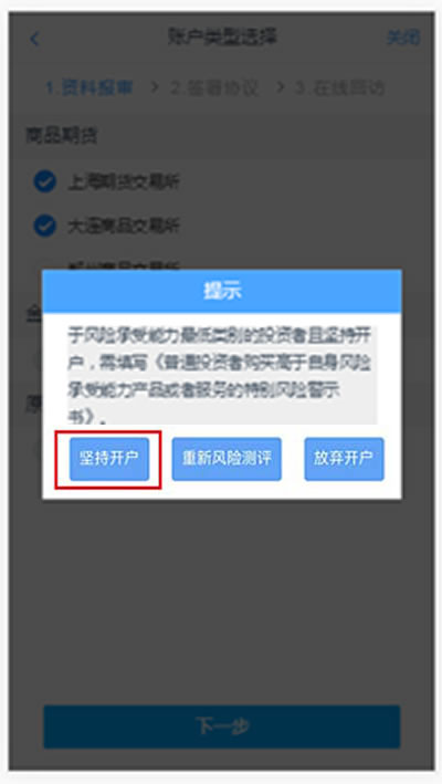 若交易者风险评测等级与选择开立的期货账户种类不匹配且坚持开户的,需要签署《普通交易者购买高于自身风险承受能力产品或者服务的特别风险警示书》。