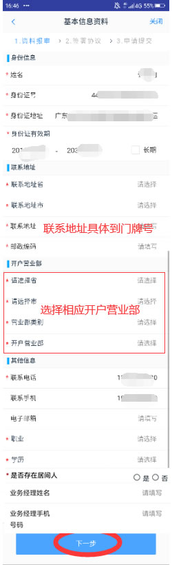 (3)所有照片都上传成功以后,请阅读“数字证书安全责任书”,阅读完成并同意后点击“下一步”进入到“个人基本资料”页面。资料填写注意事项:1.联系地址具体到门牌号 2.营业部依次按省、市对应营业部。 3.推荐人填对应的居间人或客户经理。