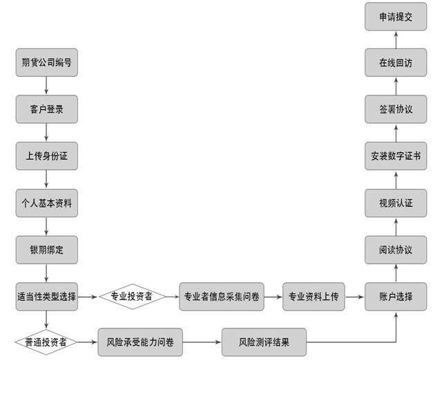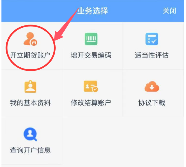 (1)开立期货账户:新开期货账户,选择此项进入下一步。 (2)修改结算账户:对于存量客户,选择此项可进行增加或变更银行卡信息。 (3)我的基本资料:对于存量客户,选择此项可进行修改客户一般信息(如身份证有效期、联系电话、联系地址、邮编、学历等) (4)适当性评估:对于存量客户,选择此项可重新进行适当性测评。 (5)协议下载:对于存量客户,选择此项可下载已签署的开户协议。 (6)增开交易编码:对于存量客户,选择此项可申请其他未开通的交易所编码。