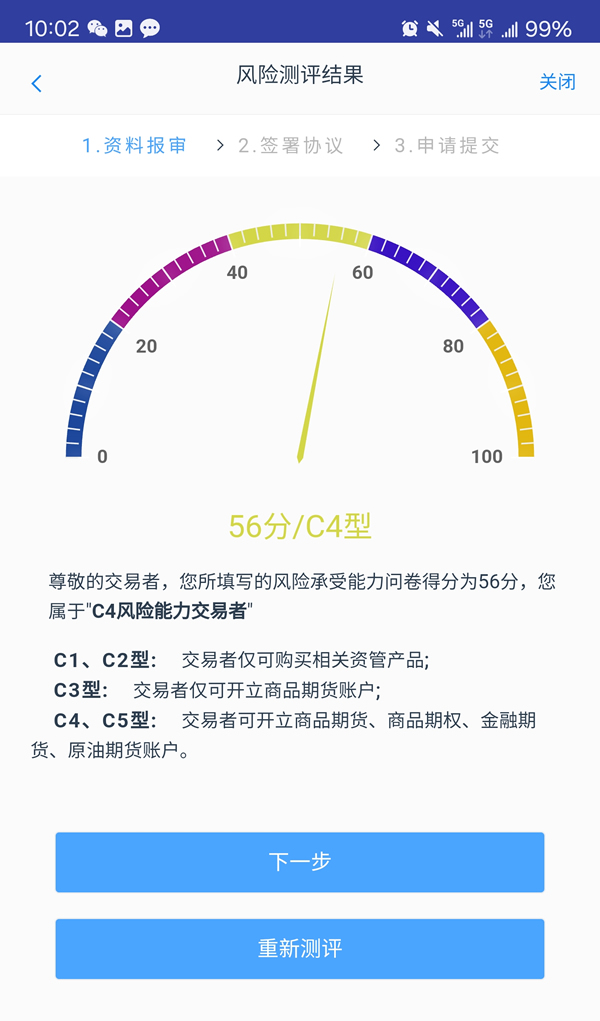 完成测评后,进入风险测评结果界面,有分数及相应的等级。如对测评结果不满意,可重新测评;无异议点击下一步。