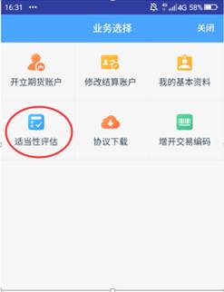登录期货开户云五期APP,填写公司编码(0166)进行选择公司,点击“业务办理”进入业务选择界面,点击“适当性评估”,进入登录界面,输入身份证号、图形验证码,账户类型请选择为“期货经纪”,再输入短信验证码,系统会自动给客户开户时预留的手机号码发送短信验证码。 请仔细核对界面《隐私政策》下方滚动提示的手机号,若目前使用的手机号与提示的手机号不一致,请联系期货公司进行变更。