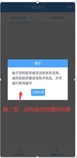 “适当性评估”业务分为3类: 1.客户在开户云系统中存有适当性类型并且为普通投资者类型; 2.客户在开户云系统中没有适当性评测结果,需要补做适当性测评; 3.系统提示暂不支持专业投资者进行适当性评估业务。