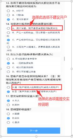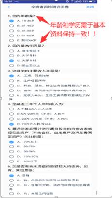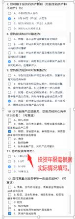 (1)下一步进入投资者风险测评问卷页面。客户只需根据自身实际情况选择,系统会自动显示客户上一次风险测评的记录,客户可在此基础上进行修改。