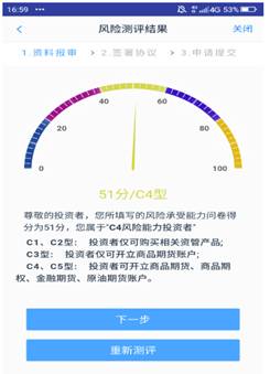 (2)完成测评后,进入风险测评结果界面,有分数及相应的等级。如对测评结果不满意,可重新测评;无异议点击下一步。